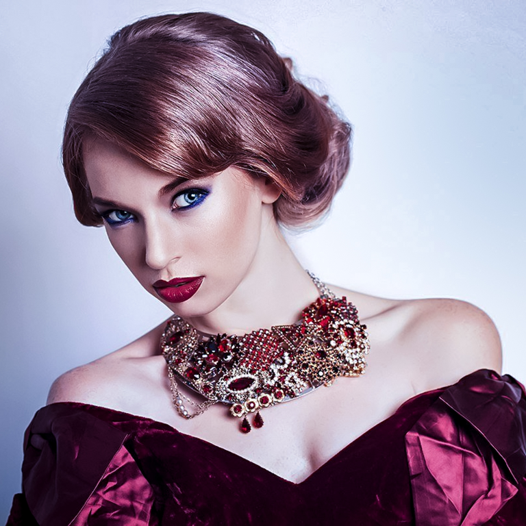 rassemblés en chignon élégant lors des Elysiums les plus exigeants, yeux bleu vert